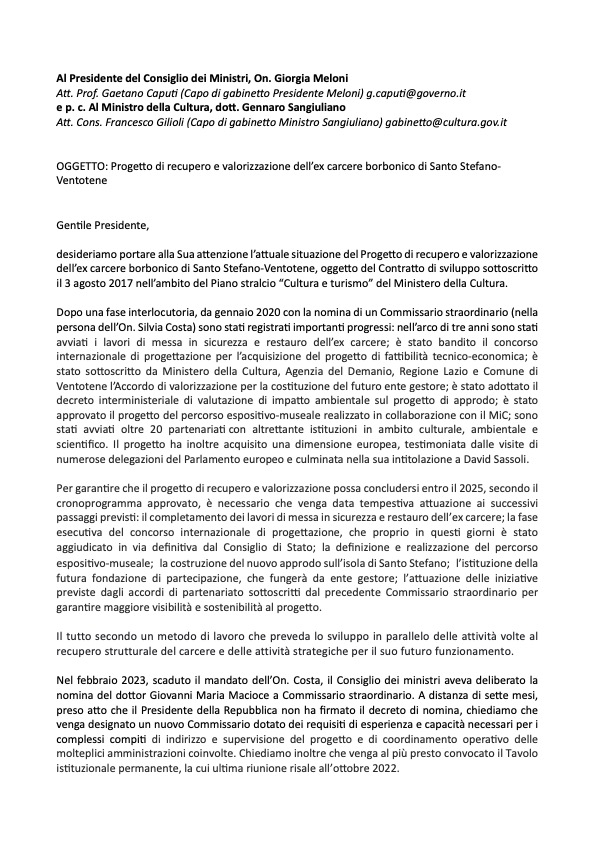 desideriamo portare alla Sua attenzione l’attuale situazione del Progetto di recupero e valorizzazione dell’ex carcere borbonico di Santo Stefano-Ventotene, oggetto del Contratto di sviluppo sottoscritto il 3 agosto 2017 nell’ambito del Piano stralcio “Cultura e turismo” del Ministero della Cultura.