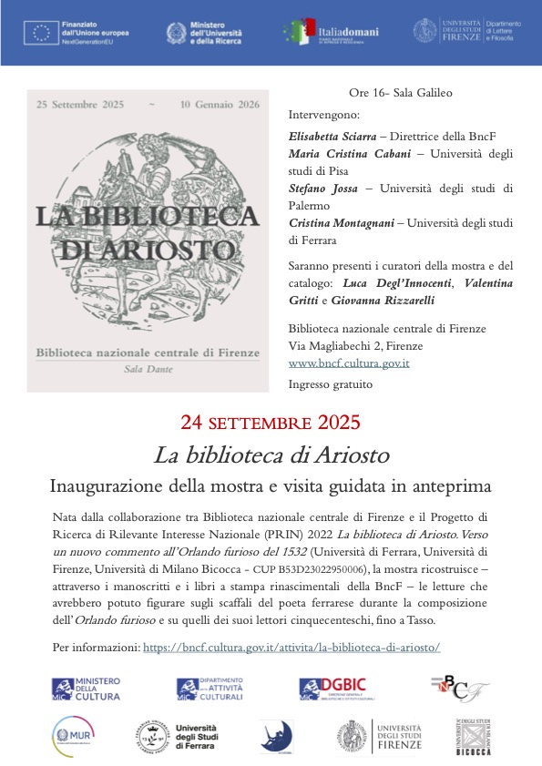 Nata dalla collaborazione tra Biblioteca nazionale centrale di Firenze e il Progetto di Ricerca di Rilevante Interesse Nazionale (PRIN) 2022 La biblioteca di Ariosto. Verso un nuovo commento all’Orlando furioso del 1532 (Università di Ferrara, Università di Firenze, Università di Milano Bicocca - CUP B53D23022950006), la mostra ricostruisce – attraverso i manoscritti e i libri a stampa rinascimentali della BncF – le letture che avrebbero potuto figurare sugli scaffali del poeta ferrarese durante la composizione dell’Orlando furioso e su quelli dei suoi lettori cinquecenteschi, fino a Tasso.