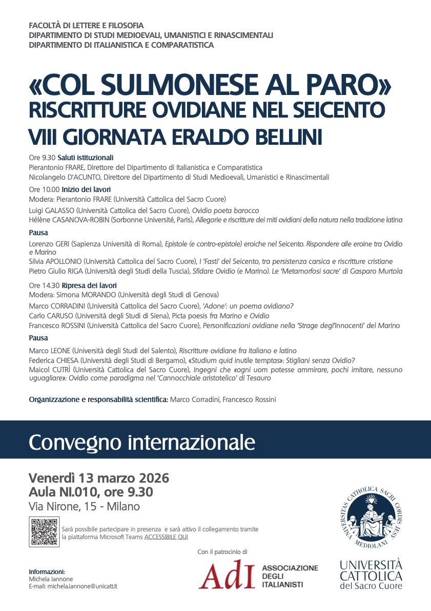 Si segnala l'VIII Giornata per Eraldo Bellini, "Col Sulmonese al paro". Riscritture ovidiane nel Seicento, che si terrà in Università Cattolica del Sacro Cuore - Milano il giorno 13 marzo 2026, ore 9.30, con possibilità di collegamento da remoto.